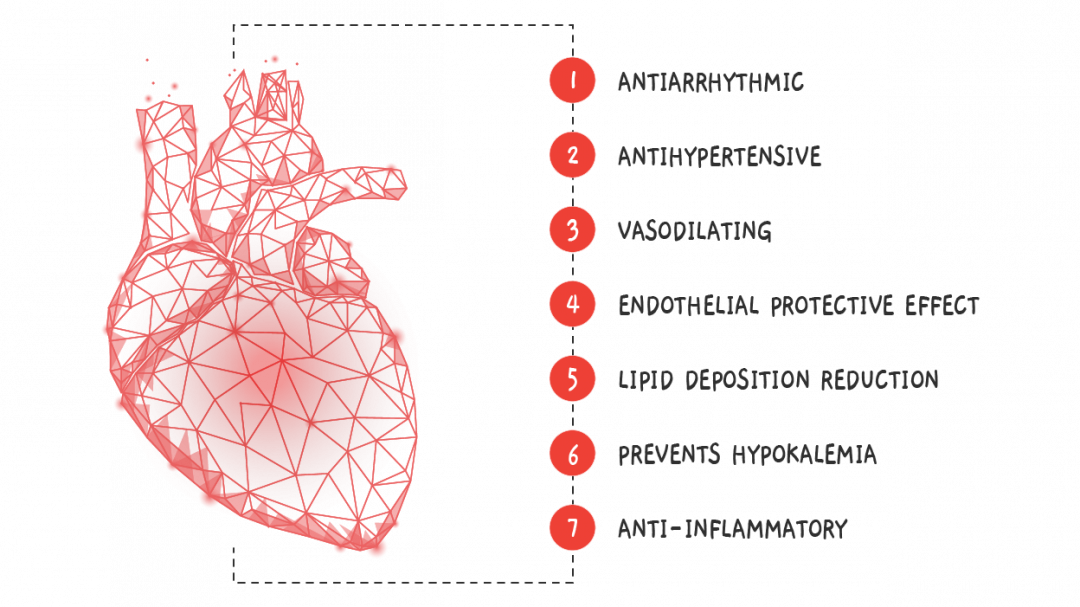 Lowers systolic and diastolic blood pressure. Prevents ischemic stroke and cardiac arrhythmias. Maintains healthy heartbeat.
